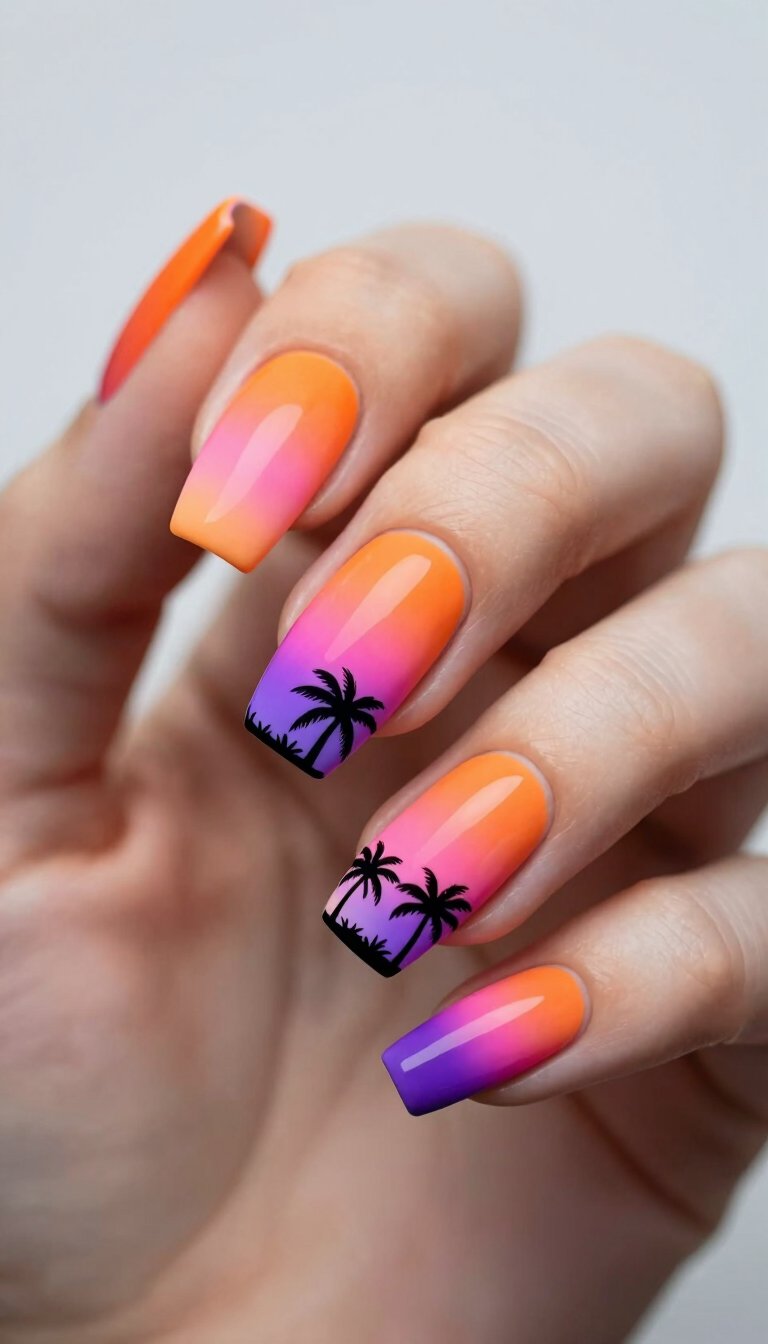 Capture the magic of golden hour. This design uses a breathtaking orange, pink, and purple gradient as a backdrop. Then, using black acrylic or polish, your nail tech paints tiny palm tree or city skyline silhouettes along the tip line.