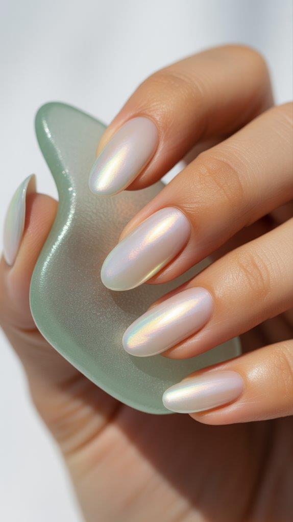 We all know the chrome powder trend, but for summer, try it over a sheer milky white base. This creates a pearl-like shimmer that looks like the inside of a seashell. It’s a sophisticated way to wear “sparkle” without looking like a craft project. IMO, this is the most “expensive” looking set on this list. 🙂