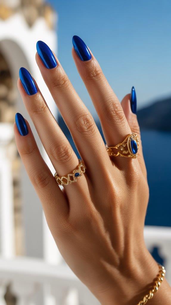 Forget the pale blues of spring; summer belongs to cobalt blue. This deep, rich shade mimics the Mediterranean Sea and looks stunning on almond-shaped nails. I love pairing this with gold rings to create a luxury yacht vibe, even if I’m just sitting in a plastic kiddie pool.