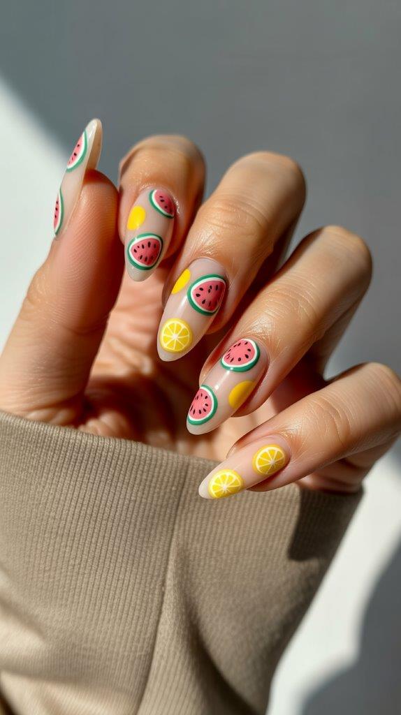 Why choose one fruit when you can have a salad on your fingers? Ask your tech for hand-painted watermelons, lemons, or cherries on a nude base. Keeping the base neutral ensures the art remains the star of the show. It’s playful, cute, and surprisingly classy on a slender almond tip.