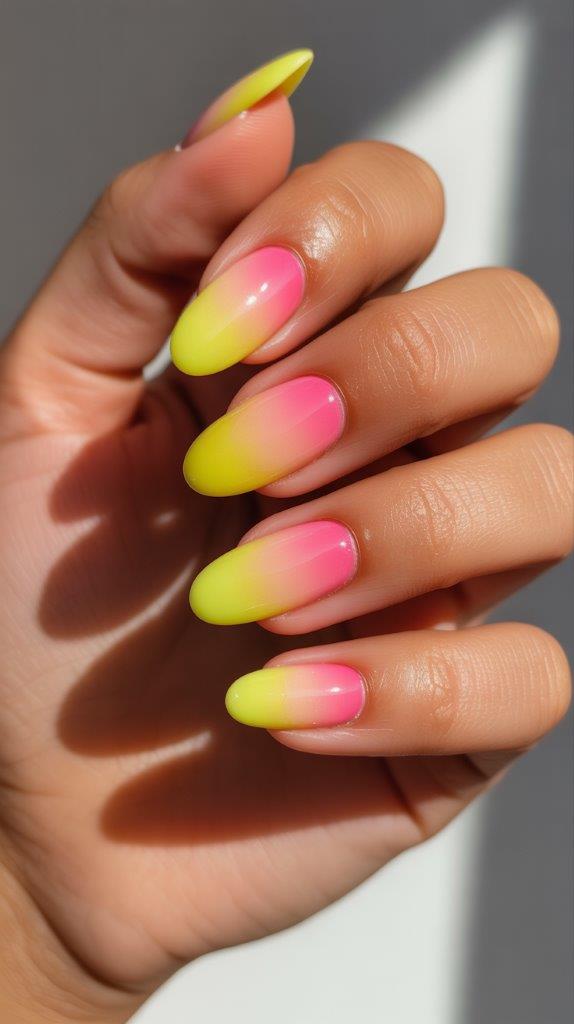 Ever looked at the sky at 8:00 PM and wished you could wear it? An ombre fade from deep pink to bright yellow captures that sunset magic perfectly. The almond shape provides the perfect vertical space for a smooth, seamless transition. It’s basically a vacation for your hands.