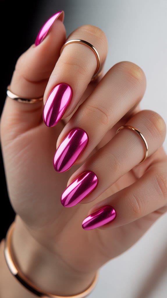 If you’re still living your best Barbie-core life, this one is for you. A vibrant pink base with a metallic chrome topcoat creates a futuristic, high-energy look. The light reflects off the tapered almond tips beautifully. It’s bold, unapologetic, and perfect for a girls’ trip.