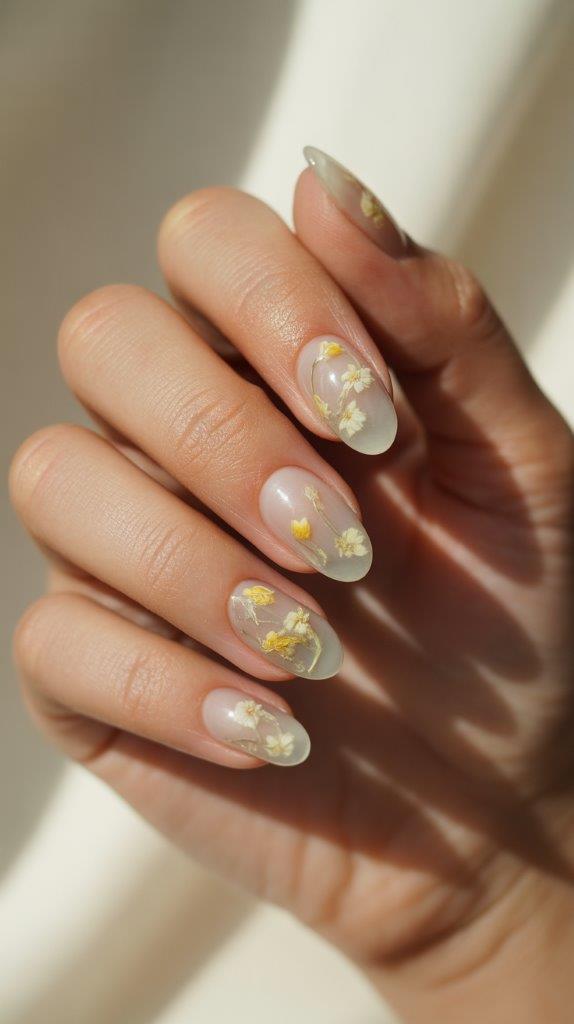 For the cottage-core enthusiasts, this look provides a soft, romantic alternative to the brights. Use a semi-translucent milky white gel and encapsulate real tiny dried flowers. It looks like a botanical garden trapped in glass. I find this style incredibly soothing to look at during a stressful workday.