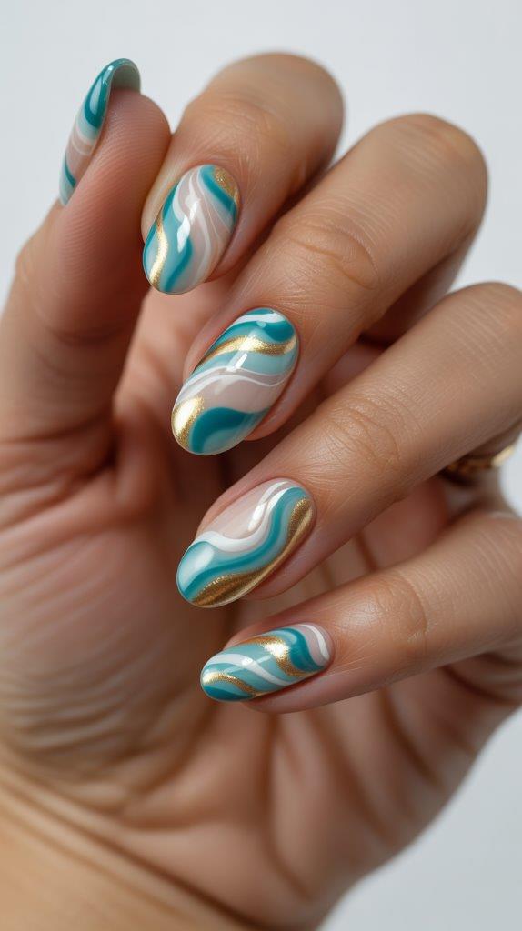 Think of the patterns on expensive Italian tiles or silk scarves. Use shades of turquoise, white, and gold to create abstract wavy lines across your nails. Since every nail looks slightly different, you don’t have to worry about perfect symmetry. It’s artistic, breezy, and very “Old Money.”