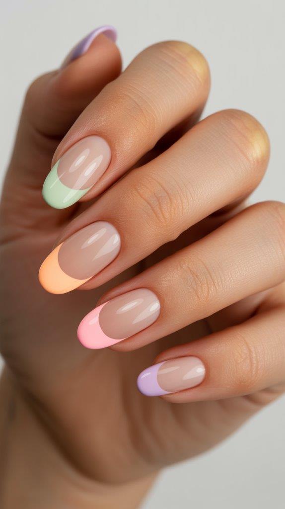 Swap the traditional white tips for a different pastel shade on every finger. Using mint green, lilac, and peach on an almond tip adds a modern twist to a classic style. It’s a subtle way to incorporate color if you aren’t ready for a full neon commitment. FYI, this look grows out very gracefully.