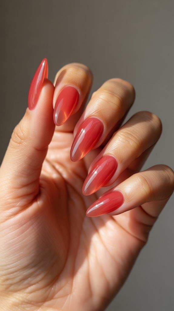 Jelly nails use a sheer, tinted gel that looks like colorful sea glass. This trend is huge right now because it looks “juicy” and fresh in the heat. Try a cherry red or a lime green jelly finish. It’s fun, a little bit nostalgic, and looks amazing under the sun.