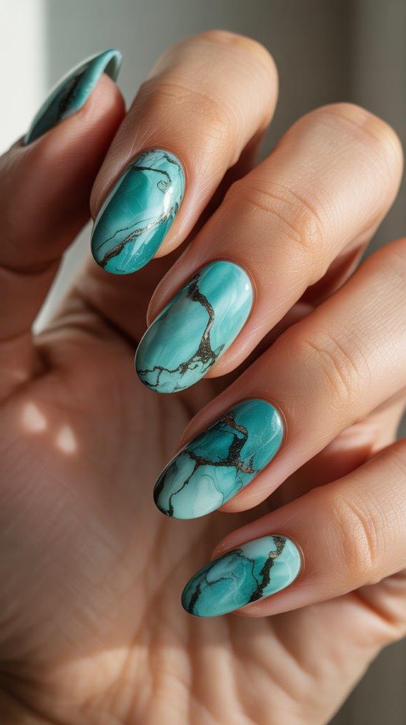 Create a marble effect using turquoise and black veins to mimic the semi-precious stone. This look feels very “desert chic” and looks incredible with turquoise jewelry. The almond shape gives the marble pattern room to breathe. It’s earthy, cool, and totally unique.