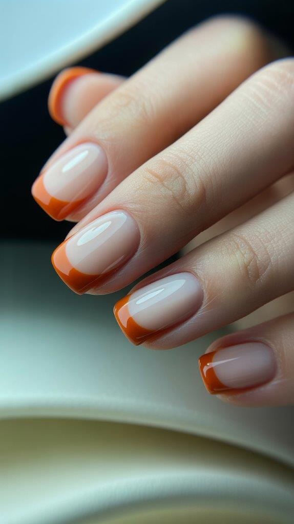 Nothing says autumn quite like the warm, spicy tones of pumpkin spice. Add a playful twist to your French tips by incorporating a burnt orange hue. This vibrant color is sure to make your nails pop while channeling the cozy essence of fall. Keep the base a neutral shade for a balanced and sophisticated look.