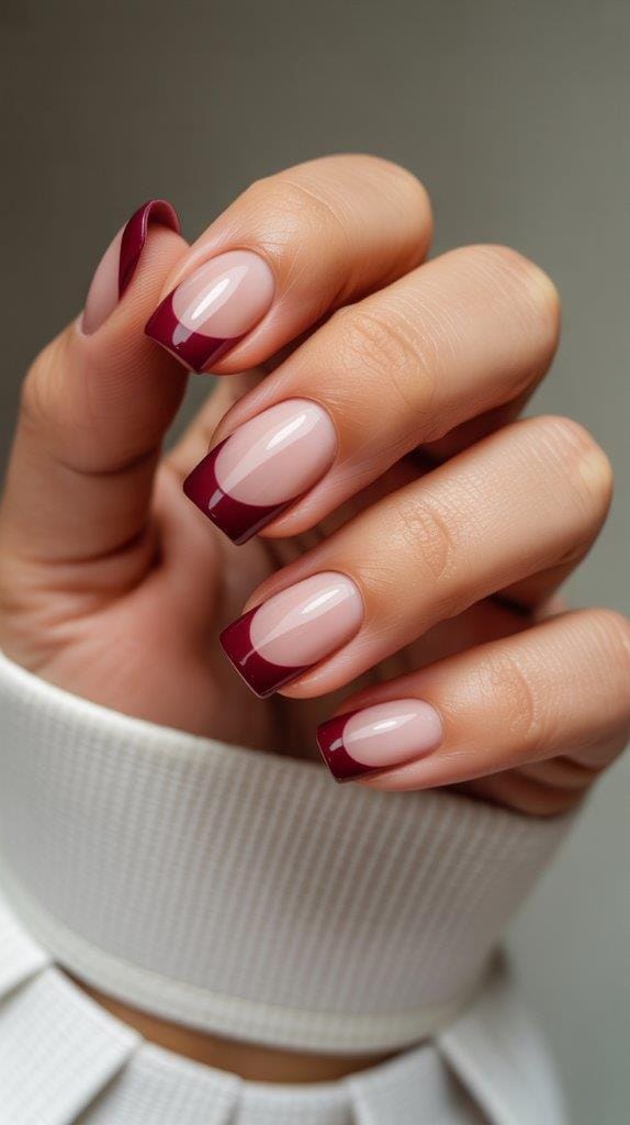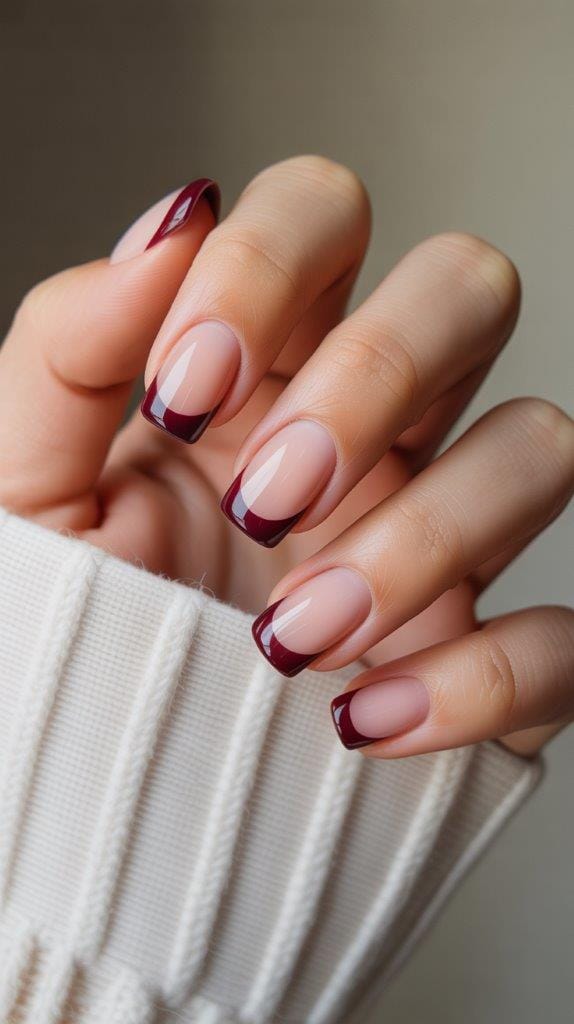 Embrace the richness of autumn with deep burgundy French tips. This shade is perfect for those who love bold, dramatic colors. Pair it with a light pink or nude base to make the tips stand out. The result is a sophisticated and chic look that’s perfect for any autumn occasion.