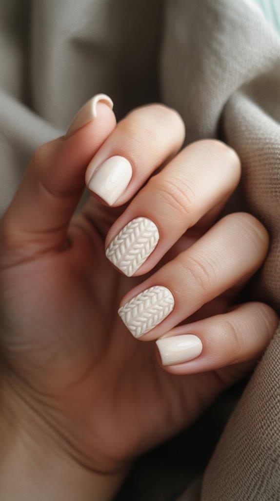 Capture the cozy feel of sweater weather with textured patterns on your French tips. Choose a soft grey or cream base and add cable-knit designs or subtle textures in a darker shade. This playful yet elegant style is sure to keep your nails snug and stylish for the season.