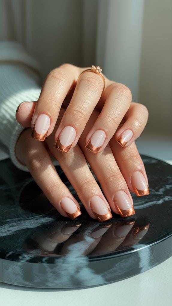 Copper is the ultimate fall color, reflecting the shades of autumn leaves. Use this metallic hue for your French tips to add a warm glow to your nails. It pairs beautifully with a neutral base, creating a sophisticated yet eye-catching look that’s perfect for the season.