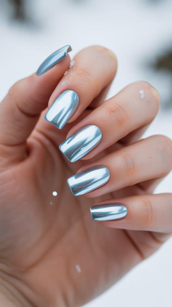 Chrome nails are having a moment, and icy blue chrome is the look for winter. The metallic finish makes your nails look like they’re made of actual ice. It’s futuristic, it’s cool, and it’s absolutely stunning.