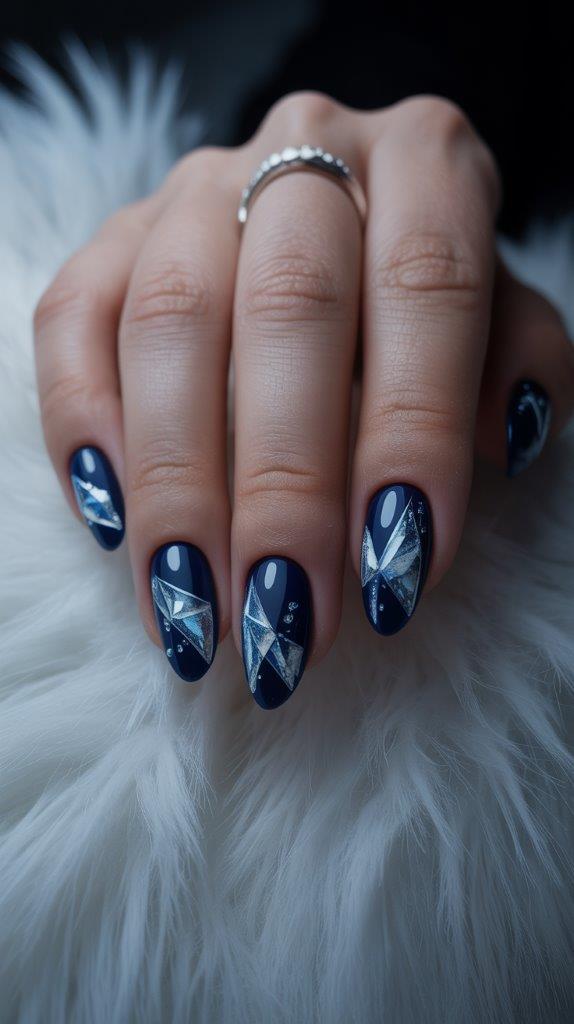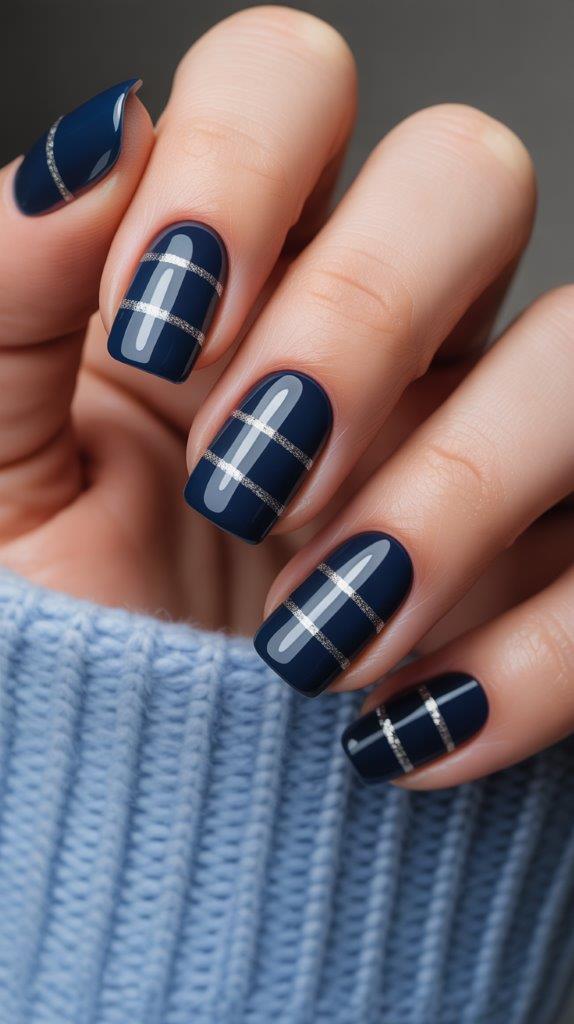 Thin silver stripes on a midnight blue base create a sleek, modern look. It’s geometric, it’s chic, and it proves that Christmas nails don’t need to be cutesy.