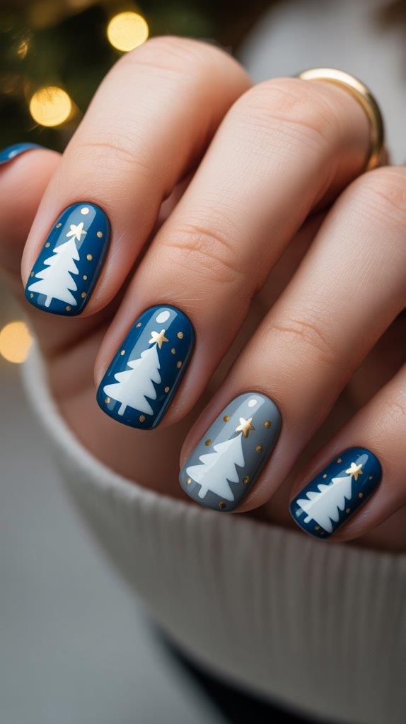 Paint miniature Christmas trees in white or silver on a blue background. Add tiny gold dots for ornaments and a star on top. It’s festive without being over-the-top.