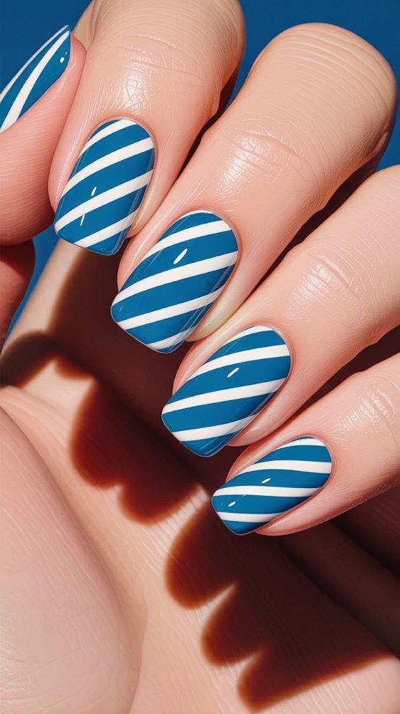 Who says candy canes have to be red? Create diagonal stripes with blue and white for a fresh take on the classic design. FYI, this looks amazing on shorter nails.