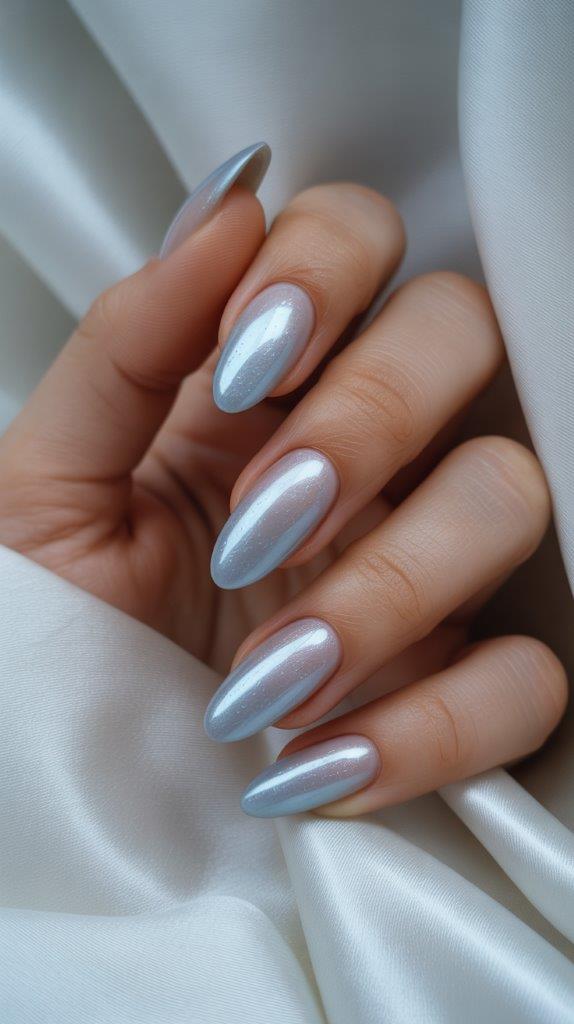 Remember when everyone obsessed over the pearly white chrome look? Take that concept but make it baby blue. You apply a sheer, milky blue base and top it with a white chrome powder. It catches the light like a shimmering cloud. It looks expensive, even if you did it in your bathroom at 2 AM.