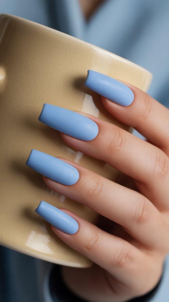 I have a love-hate relationship with matte top coats because they show scratches, but matte powder blue looks like velvet. It’s undeniably chic. Keep a little cuticle oil handy, though, because matte polish highlights dry skin like a neon sign.