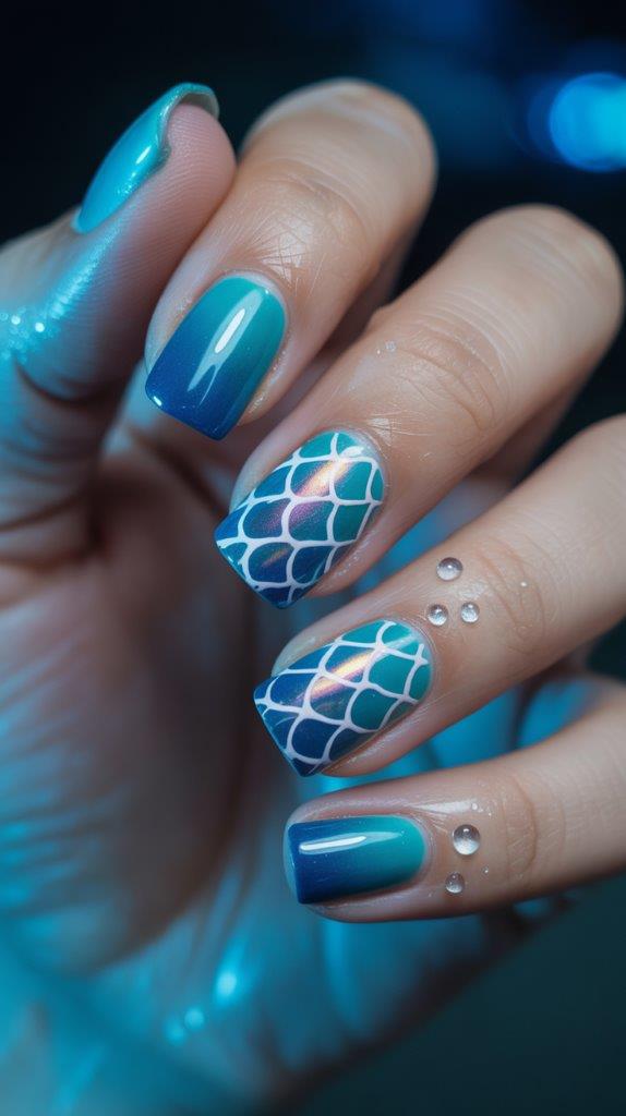 Use a fishnet stocking (yes, really) as a stencil to sponge on teal polish over a blue base. Top it with an iridescent shimmer. You instantly get that mermaid scale effect without hand-painting every single line.