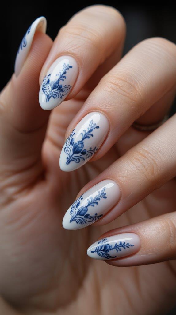 Inspired by fine china (Delftware), hand-paint intricate navy vines and leaves on a milky white base. This requires patience or a very talented nail tech, but it is a showstopper.