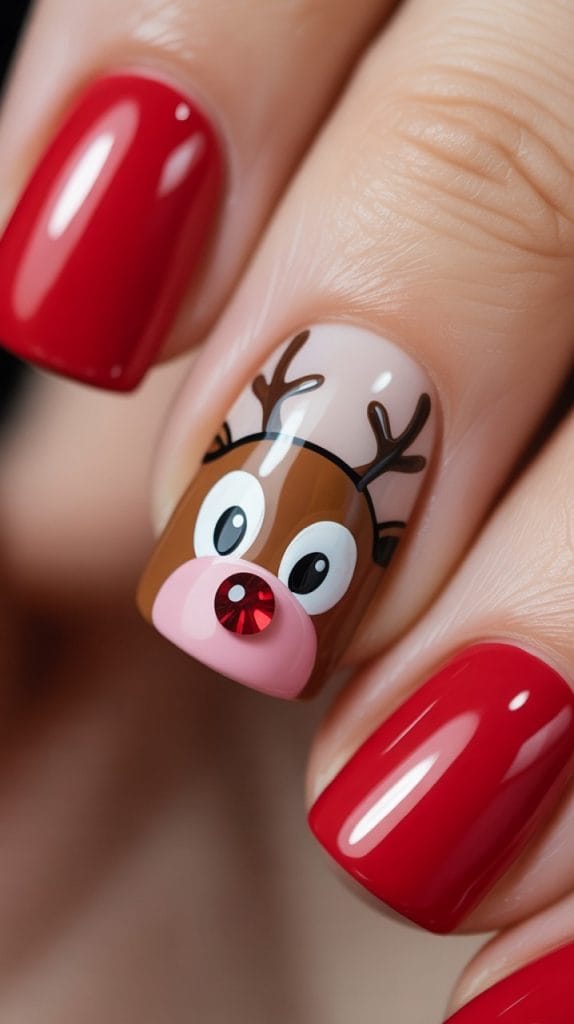 Paint a tiny Rudolph on your accent nail. Bonus points if his nose actually sparkles.