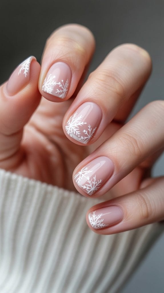 Keep parts of your nail bare while painting delicate snowflakes. Chic, trendy, and perfect if you don’t like “busy” designs.
