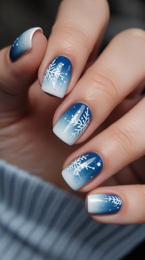 Blue ombré nails with white snowflakes = pure winter magic. Like Elsa but make it glam.