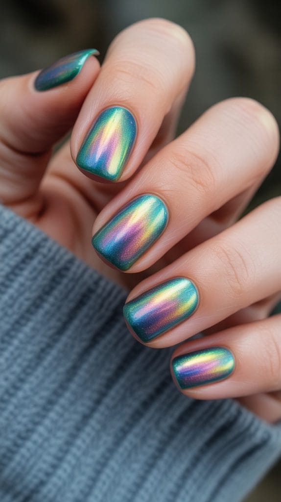 Use iridescent polish for a northern-lights effect. You’ll be hypnotized every time you move your hands.