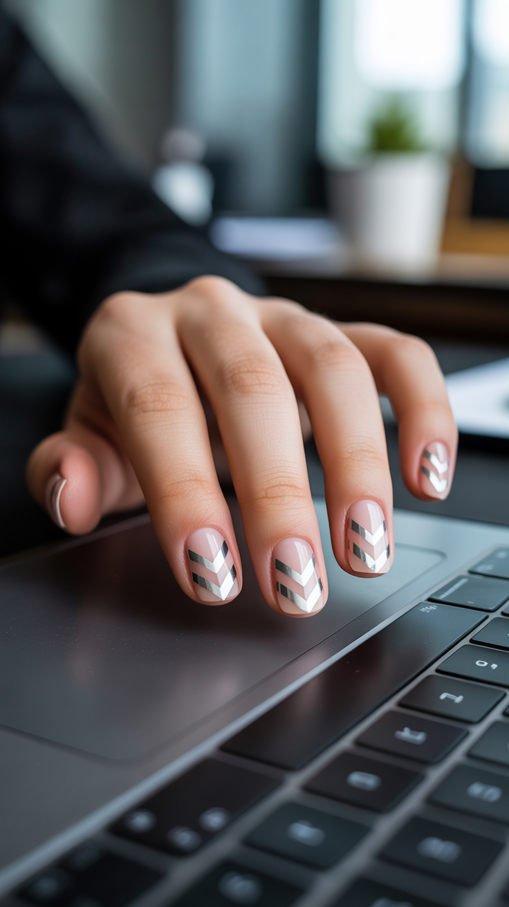 Use striping tape to create sharp, clean lines and shapes. Think chevron patterns, intersecting lines, or negative space triangles in combinations of silver, rose gold, and gunmetal. This design is for the architecture or engineering grad—structured, precise, and brilliantly modern. It makes a strong, artistic statement without a single rhinestone.