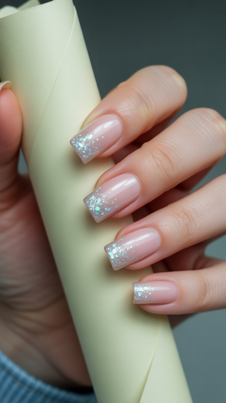 Amy, but make it graduation-ready. Start with a classic sheer pink base that lets your natural nail peek through. Then, have the artist apply the tiniest holographic glitter in a concentrated fade at the tips. It creates the illusion that your nails are literally sparkling from within. It’s feminine, professional, and has just the right amount of festive magic.