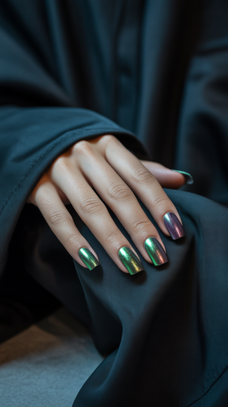 Get that otherworldly, holographic glow. A chrome powder buffed over a black or gray base creates a mesmerizing color shift—from green to purple to blue depending on the light. It’s futuristic, cool, and guarantees your nails will look different in every photo. While it’s bold, the monochromatic execution keeps it in classy graduation nails territory.