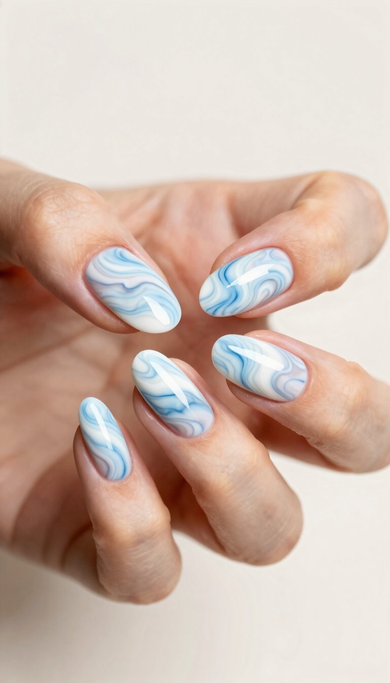 Marble doesn’t have to be dramatic. A soft, swirling marble effect using pale blue and white creates a sophisticated, organic pattern. It’s reminiscent of fine china or a serene cloudy sky—uniquely elegant and far from cookie-cutter.