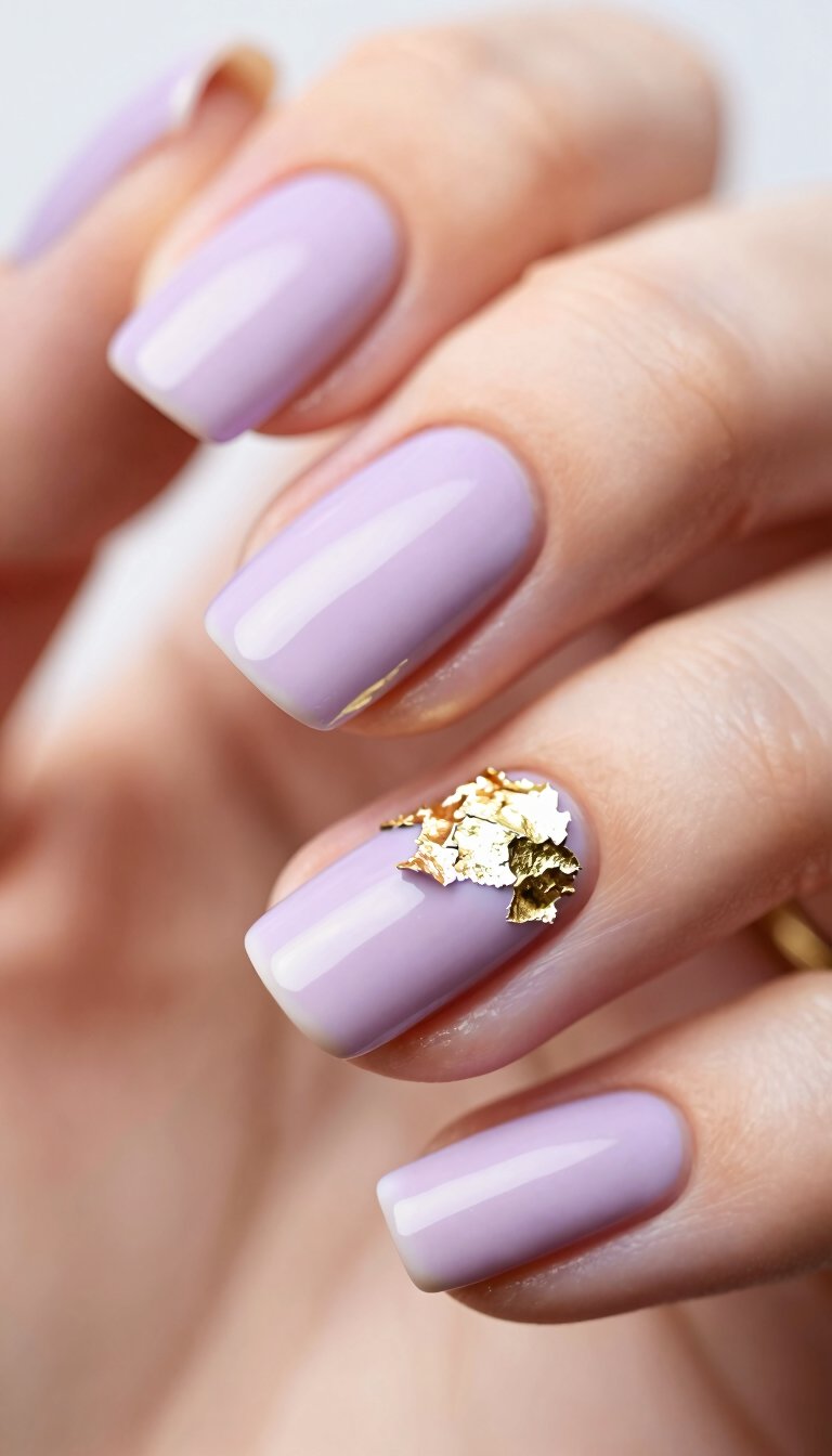 Sometimes, an accent nail is all you need. Paint all nails a soft lavender crème, then add delicate, fragmented gold foil to just your ring finger. The metallic touch elevates the entire look, adding a dose of luxury without going overboard.