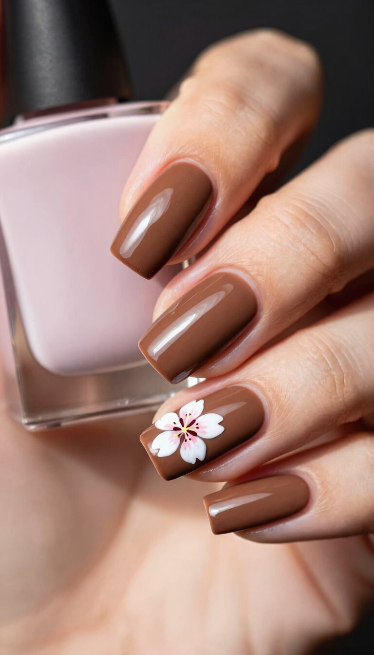 For those who can’t fully part with darker shades, pair a rich milk chocolate brown on most nails with a single accent nail featuring a delicate, hand-painted white cherry blossom. It’s a grounded, artistic, and deeply classy spring combo.