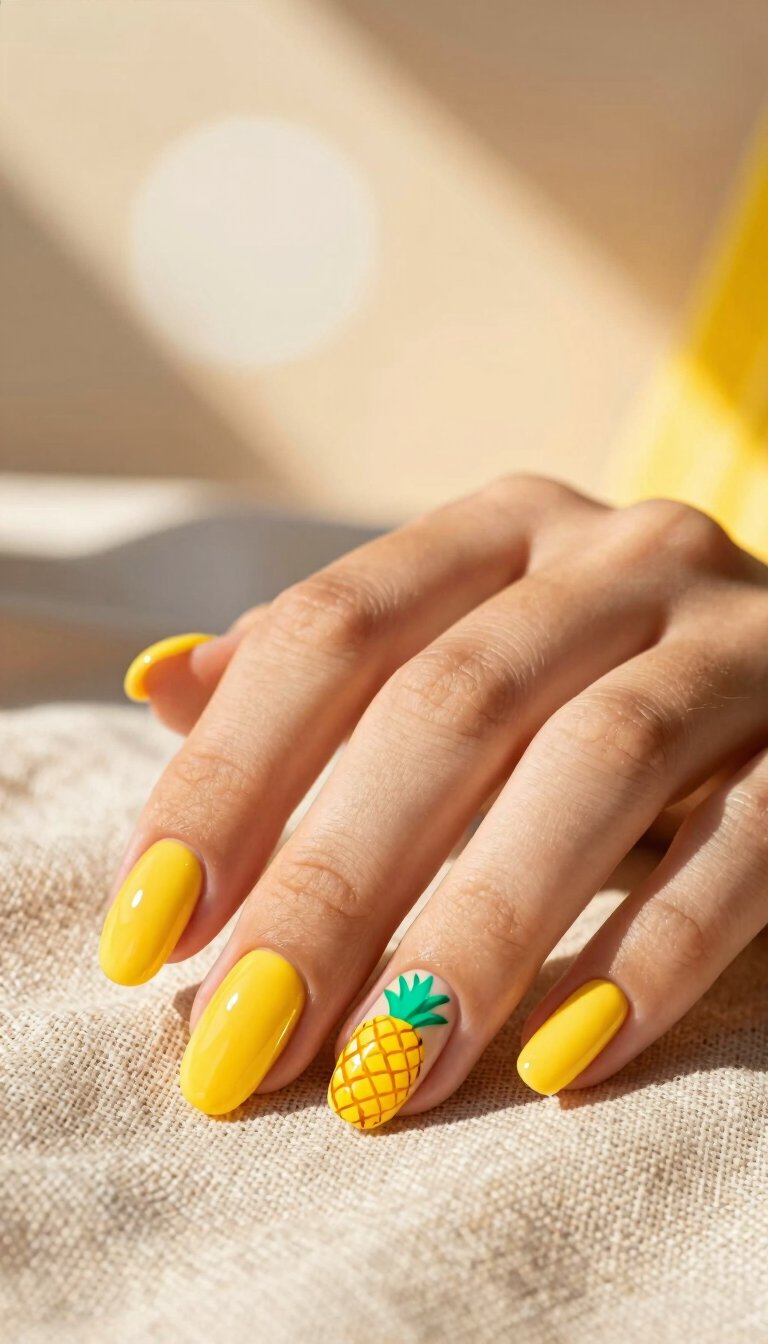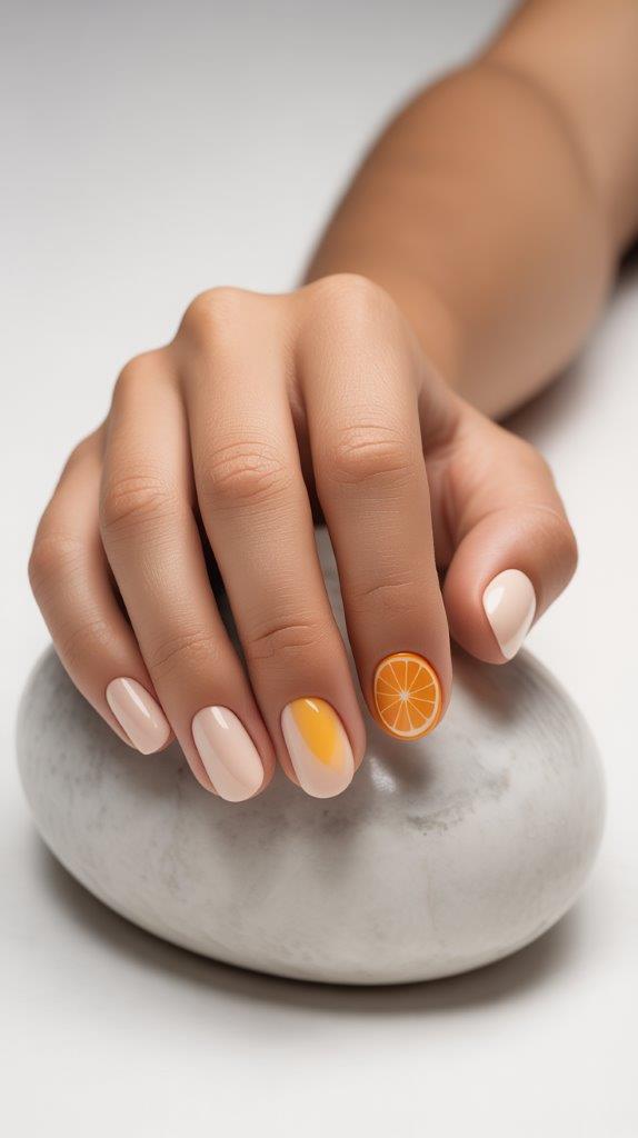 For those who love a clean, modern look, try a soft nude or white base. Then, add a single, perfect little orange or lemon slice just on the ring finger. It’s subtle, artistic, and gives off major “I have my life together” vibes. A perfect example of less being more.
