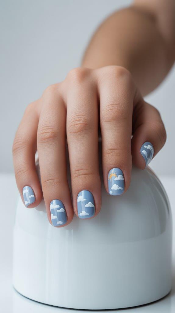 This design captures the essence of a perfect summer day. A soft, powdery blue base gets adorned with fluffy white clouds. For extra detail, add a tiny, delicate sun peeking out. It’s dreamy, calming, and goes with literally everything in your wardrobe.