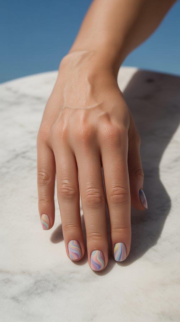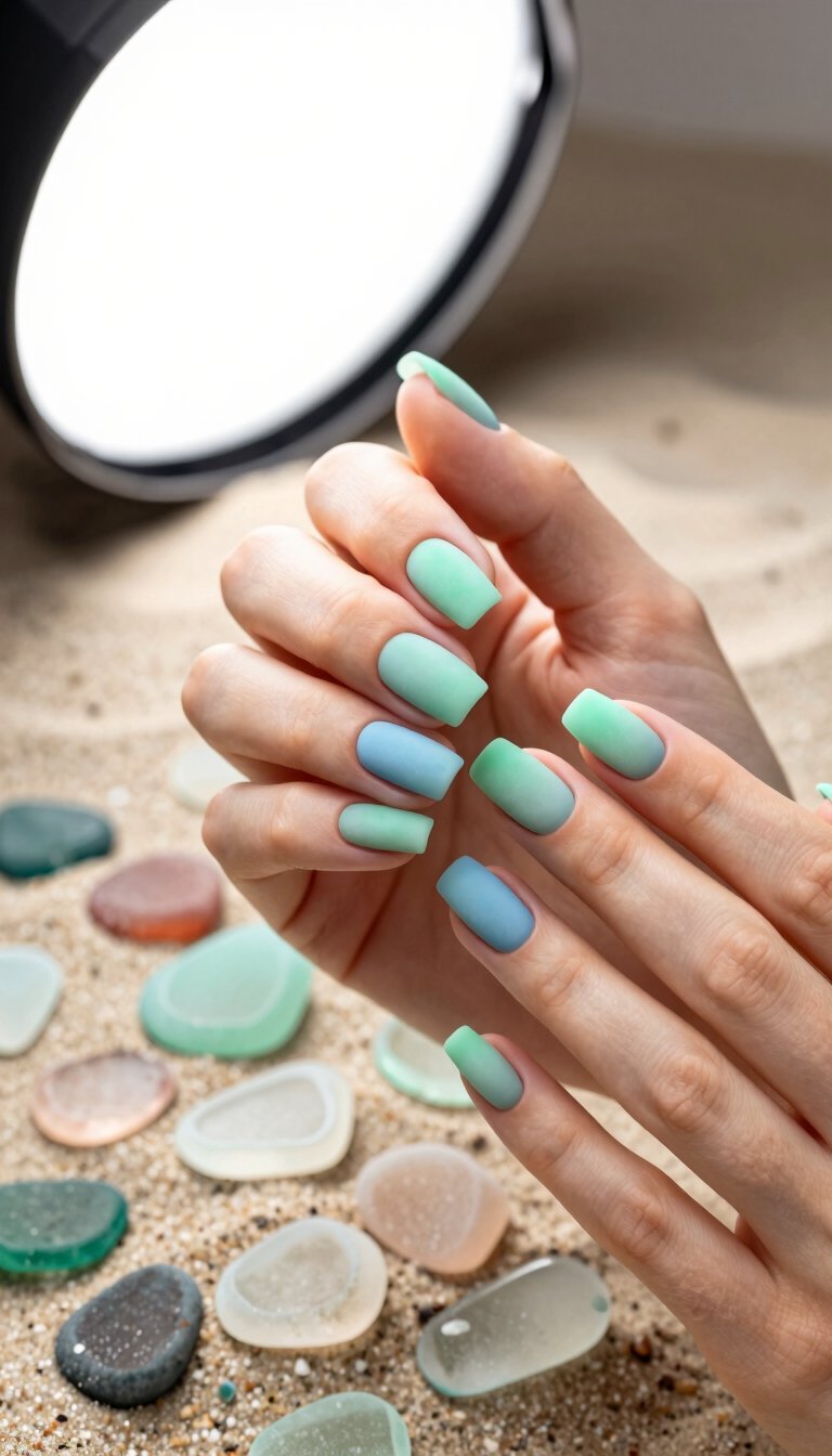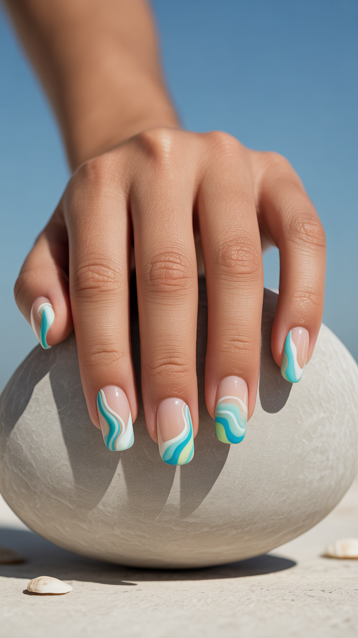Give the French manicure a beachy makeover. Instead of a straight white line, ask for wavy, swirling tips in shades of aqua, turquoise, and white. It mimics the foam of a rolling wave and looks effortlessly chic. Pair it with a sandy beige or a sheer blue base to complete the coastal look.