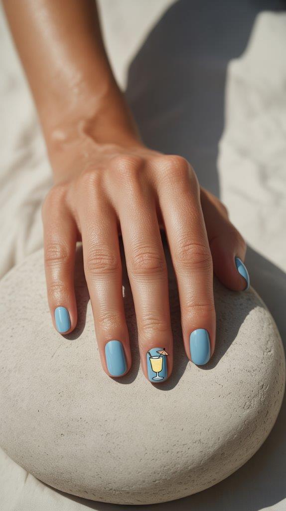 How cute is this? On a neutral or sky-blue base, paint a tiny, detailed piña colada or coconut drink complete with a straw and umbrella. It’s a humorous, conversation-starting detail that shows you don’t take yourself too seriously. Vacation mode: activated.