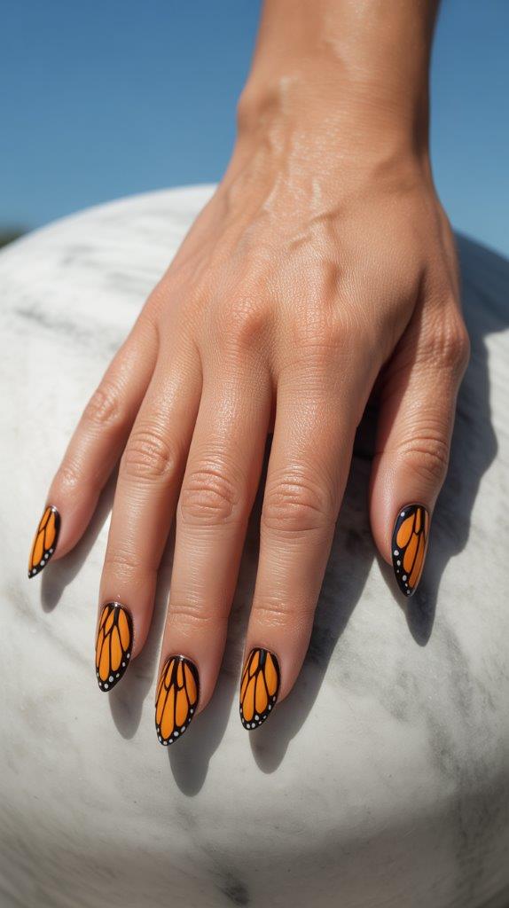 Capture the beauty of summer insects with stunning butterfly wing art. The monarch’s orange, black, and white pattern is particularly striking when painted across two nails as a pair of wings. It’s a show-stopping nail art idea that requires a skilled hand but is utterly worth it.