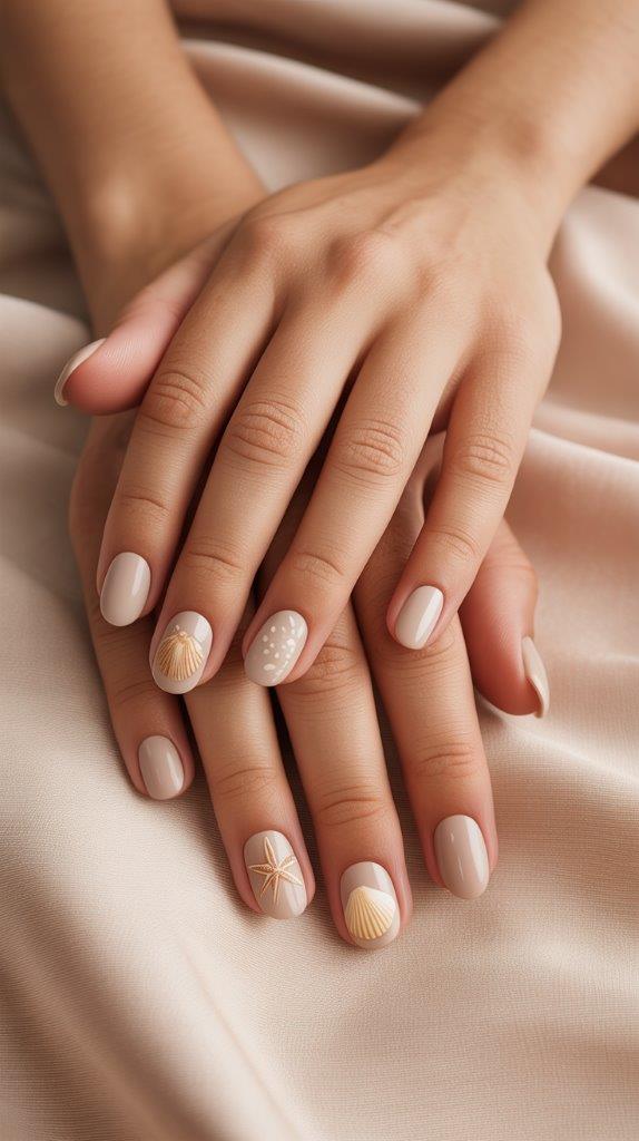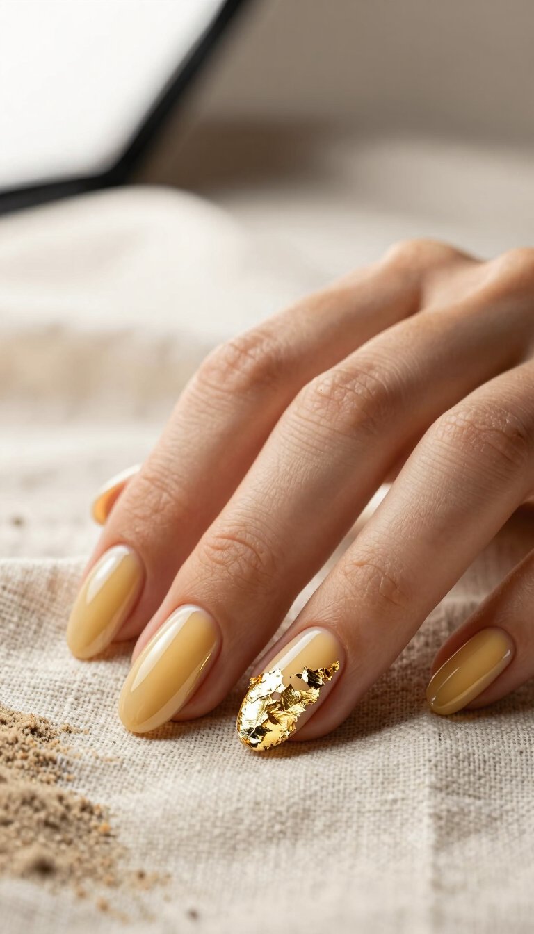 Sometimes, elegance is key. A warm, sandy nude polish looks sophisticated and elongates the fingers. Elevate it by placing irregular pieces of gold leaf or foil on one or two nails. It mimics sunlight glittering on the beach and is incredibly chic for summer weddings.