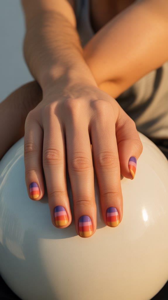 Why look at a sunset when you can wear one? Blend horizontal bands of purple, pink, orange, and yellow across your nails for an abstract gradient. No need for perfect lines—the messier, the more artistic it looks. It’s a wearable piece of art.