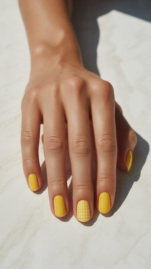 Combine two of our earlier ideas for a fresh take. A zingy lemon yellow base pairs perfectly with a tiny gingham check pattern on an accent nail. It’s like a summer kitchen towel came to life on your hands, in the best possible way. Bright, cheerful, and totally instagrammable.