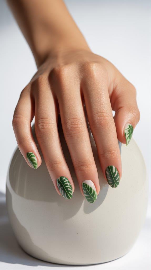 Think monstera or banana leaves in deep, lush green against a white or blush base. You can use a stamping plate for perfect repetition or go for hand-painted variation. This design feels rich, botanical, and instantly transports you to a rainforest canopy. 😉