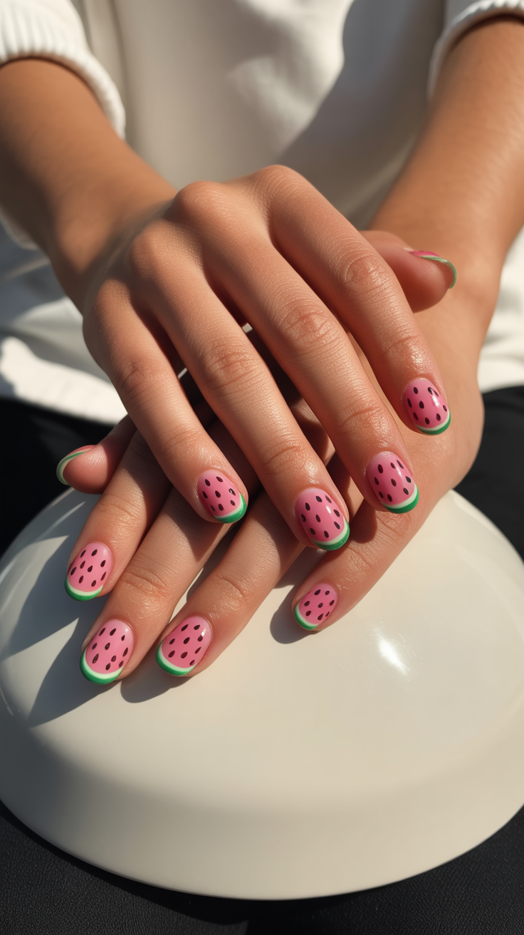 Could anything be more summer? This playful design features that iconic pink-and-green combo, complete with little black seed dots. You can go for a full slice on each nail or a cute accent on a pastel green base. It’s sweet, it’s fun, and it practically smells like picnic season.
