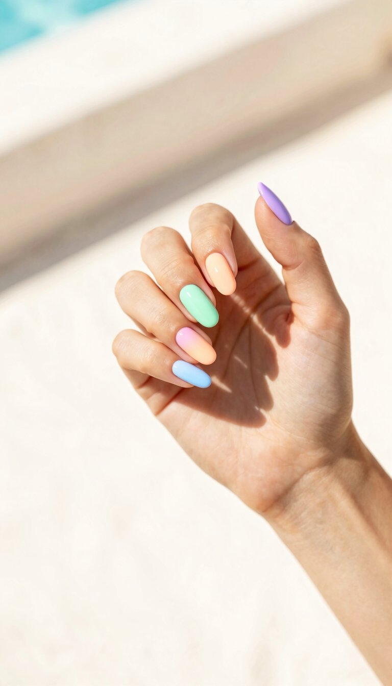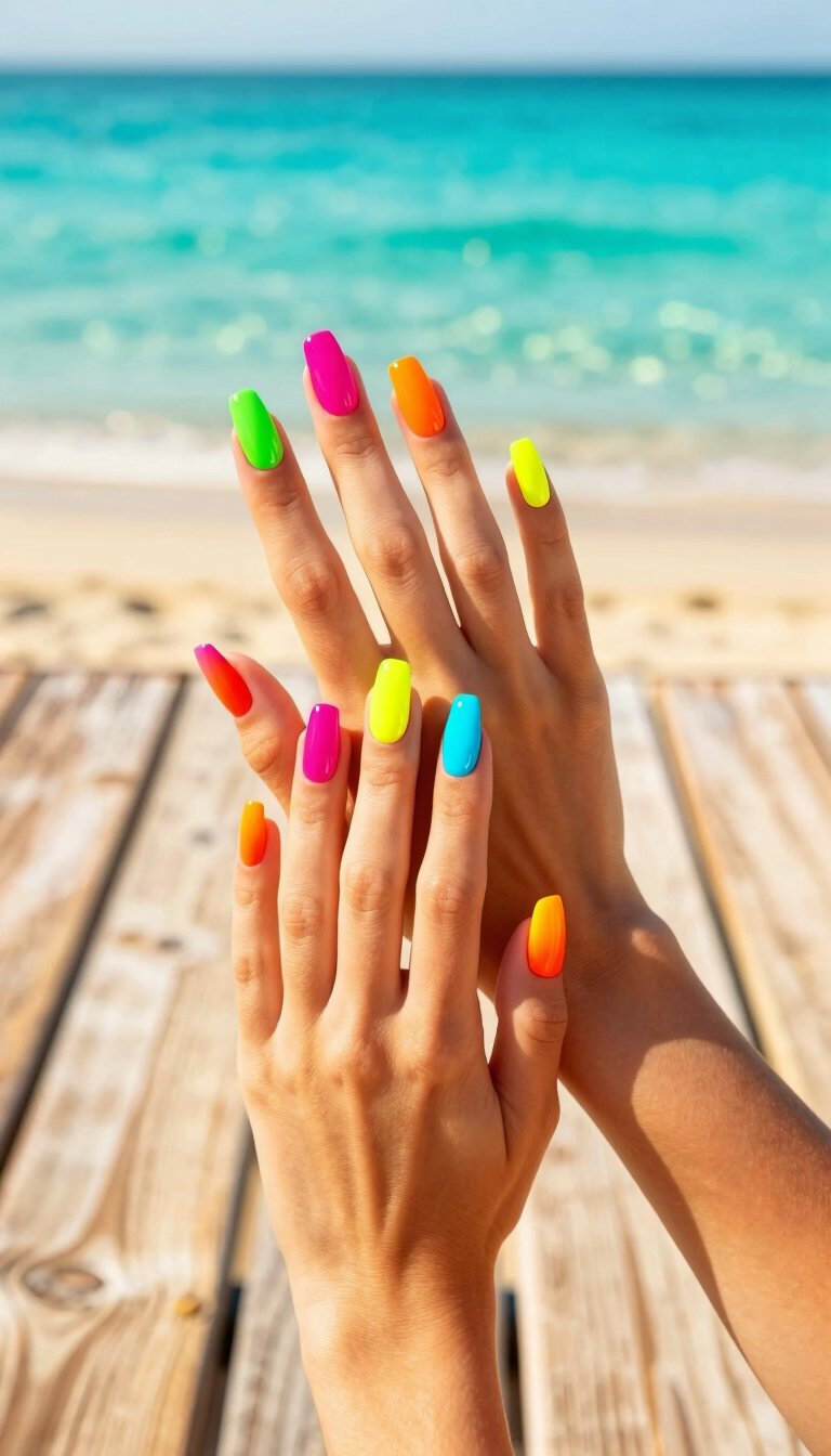 Can’t choose just one neon? Don’t. Paint each nail a different electric hue—think magenta, lime green, orange, and cyan. The skittles manicure trend is ideal for summer because it’s bold, playful, and guarantees you’ll stand out. Bonus: it looks amazing with a tan.