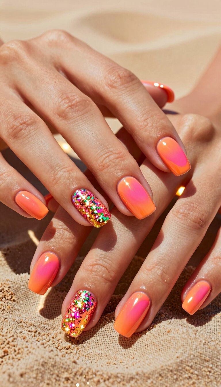 A glossy, vibrant coral polish is a summer classic for a reason. It’s warm, flattering, and energizing. For extra depth, ask for a scattered holographic glitter topcoat that catches the light like sunbeams through water. Simple, stunning, and oh-so-summery.