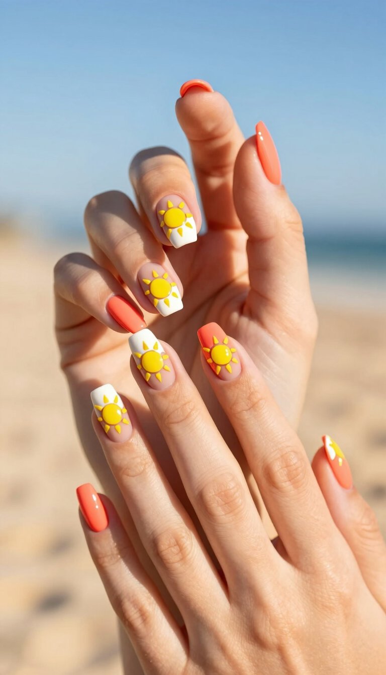 Let your natural nail peek through. Using nail vinyls or precise brushing, create simple sun or ray shapes that are “cut out” of a block of color. For example, a yellow sun shape surrounded by a solid coral border. It’s modern, airy, and perfect for hot days.