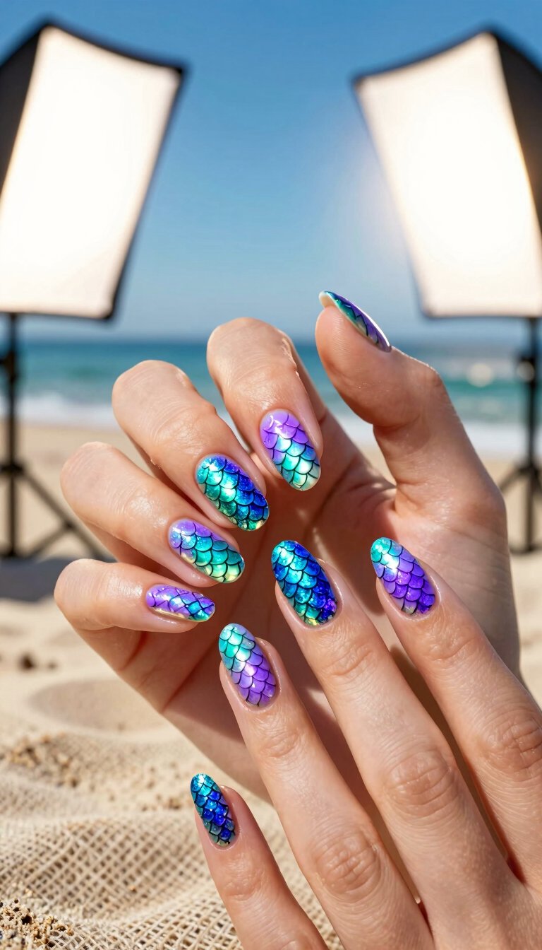 Dive into fantasy with shifting, shimmery scales. Use a special mermaid-scale stamping plate or a glitter topcoat that reflects light in blues, greens, and purples. It’s like wearing a piece of the ocean’s magic on your hands. Seriously, you might just start gazing at your own nails.