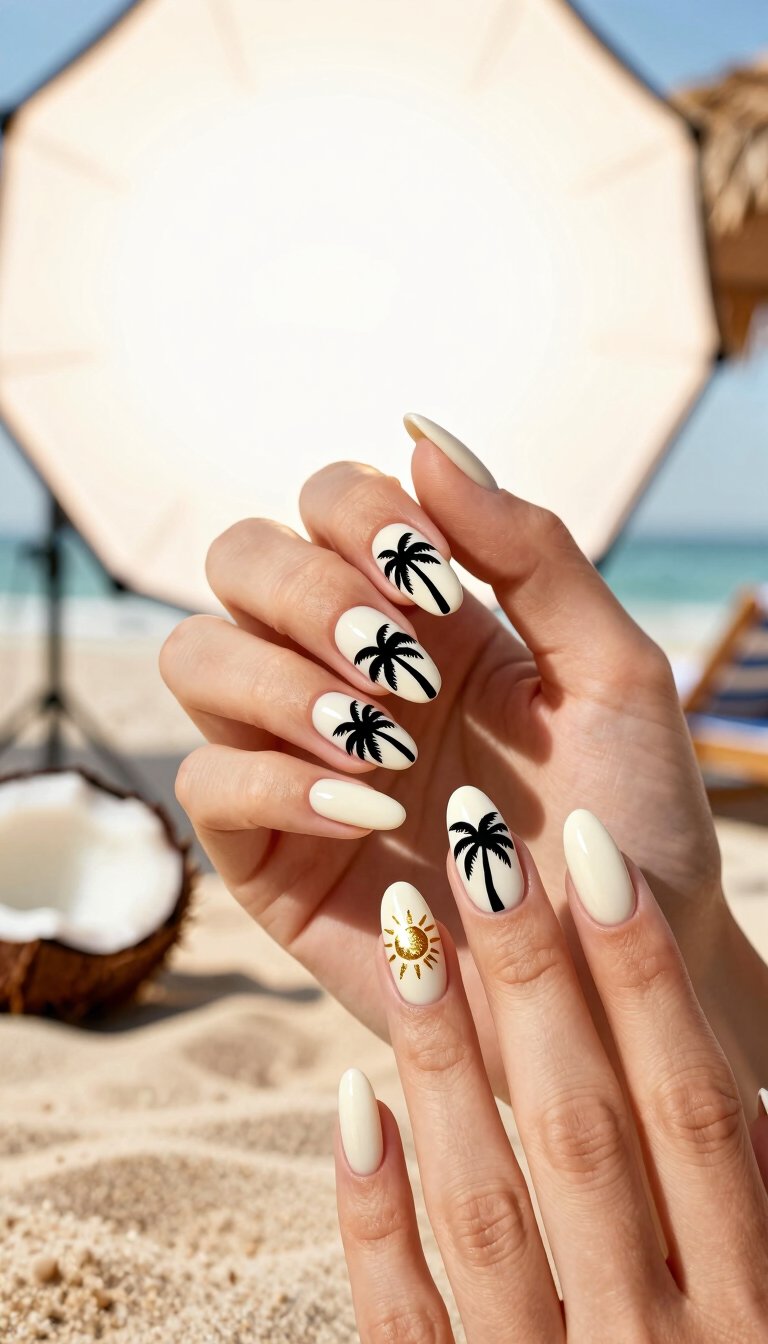 Channel instant island vibes with this classic. A crisp white or nude base makes those black or dark green palm silhouettes pop. Pro tip: add a tiny, shimmering sun on your accent nail for that golden hour glow. It’s a low-effort, high-impact design that your nail tech can whip up in no time.