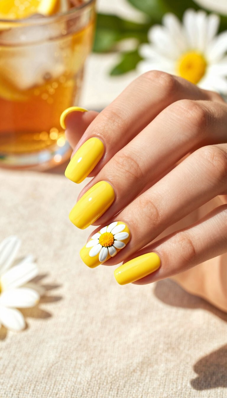 Nothing says “happy summer” like a bright, buttery yellow polish. Keep it simple on most nails and let one or two feature hand-painted white daisies with a tiny yellow center. This design is pure, unadulterated joy and pairs perfectly with sundresses and iced tea.