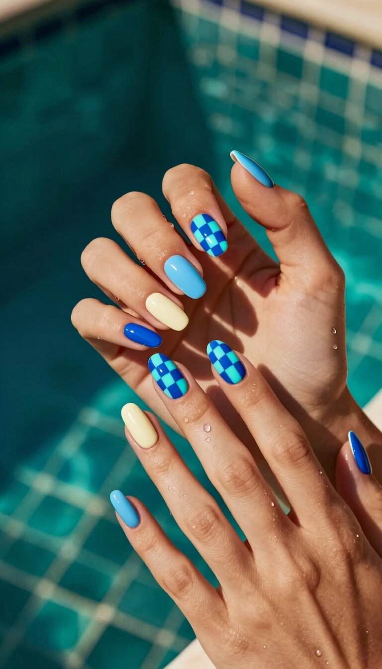 This design combines two summer staples: swimming pools and retro patterns. A classic light and dark blue check on a few nails, paired with solid cream blue on others, feels both nostalgic and trendy. It’s giving major vintage resort vibes, and I’m here for it.